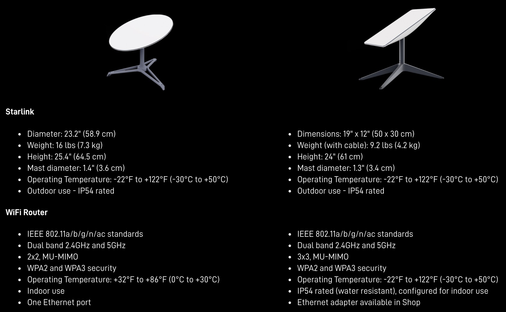 The rectangular satellite dish that will be sent to new users is 19×12 inches, compared to the original circular dish’s diameter of 23.2 inches. The dish’s weight is 9.2 lbs, down from the original’s 16 lbs. The operating temperature range of -22°F to +122°F (-30°C to +50°C) is unchanged, so the thermal shutdowns that have affected some users of the original “Dishy McFlatface” satellite dish could continue to be a problem.
